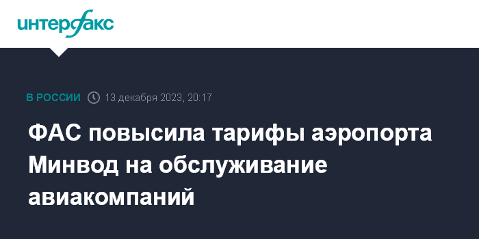 Москва. 13 декабря. INTERFAX.RU - Федеральная антимонопольная служба увеличила тарифы на обслуживание авиакомпаний в международном аэропорту "Минеральные Воды". Об этом говорится в приказе ФАС, опубликованном на официальном портале правовой информации.