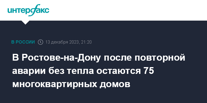 Москва. 13 декабря. INTERFAX.RU - В Ростове-на-Дону из-за повторной аварии на высоковольтной линии электропередач Ростовэнерго в Аксайском районе отключились шесть котельных и без тепла остались жилые дома, школы и детские сады, сообщил в Telegram глава администрации города Алексей Логвиненко.