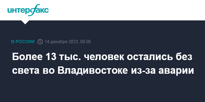 Москва. 14 декабря. INTERFAX.RU - Отключение электроэнергии произошло во Владивостоке из-за аварии на подстанции, без света остались более 13 тыс. человек, сообщает региональная прокуратура.