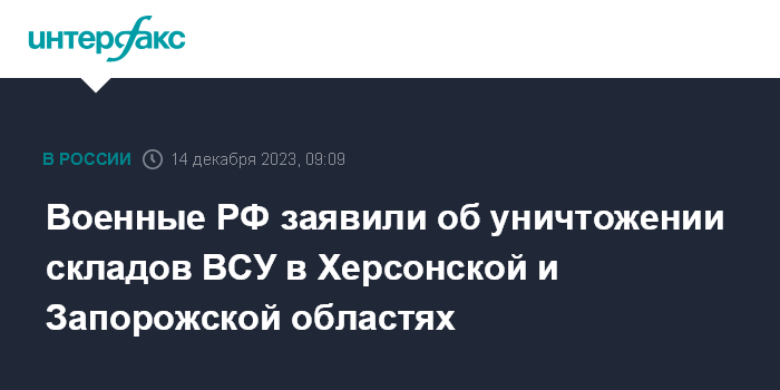 Москва. 14 декабря. INTERFAX.RU - Минобороны РФ сообщило об уничтожении двух складов вооруженных сил Украины (ВСУ) с ракетно-артиллерийским вооружением в Херсонской и Запорожской областях.
