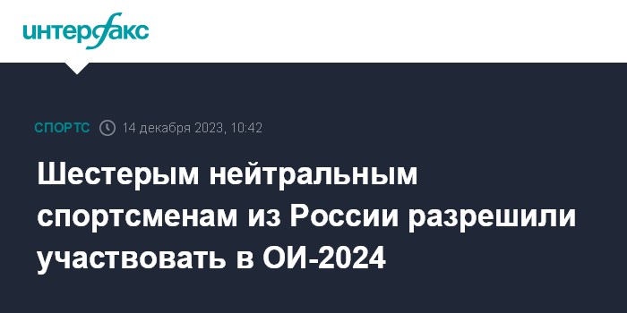 Москва. 14 декабря. INTERFAX.RU - Международный олимпийский комитет изменил информацию о допущенных к участию в Олимпиаде в Париже в 2024 году нейтральных спортсменах из России, теперь таких спортсменов шесть, сказано на сайте МОК.