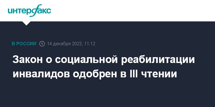 Москва. 14 декабря. INTERFAX.RU - Госдума приняла в третьем чтении правительственный закон о социальной реабилитации инвалидов.