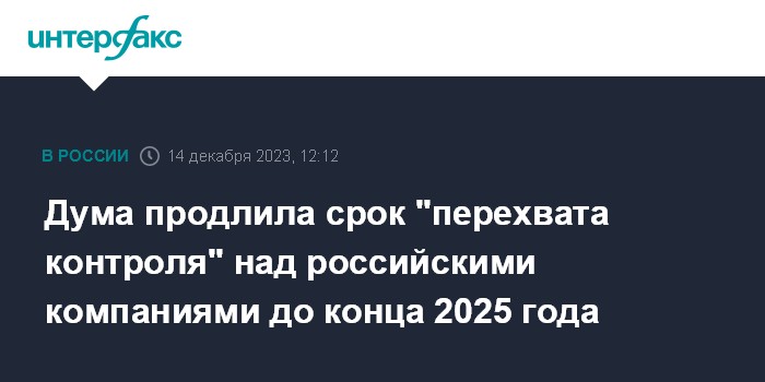 Москва. 14 декабря. INTERFAX.RU - Госдума приняла во втором и третьем чтениях закон, который продлевает до конца 2025 года возможность для резидентов РФ получить корпоративные права в российских организациях, которыми они сейчас владеют через контролируемые иностранные компании (КИК) в "недружественных" юрисдикциях (перехват контроля).