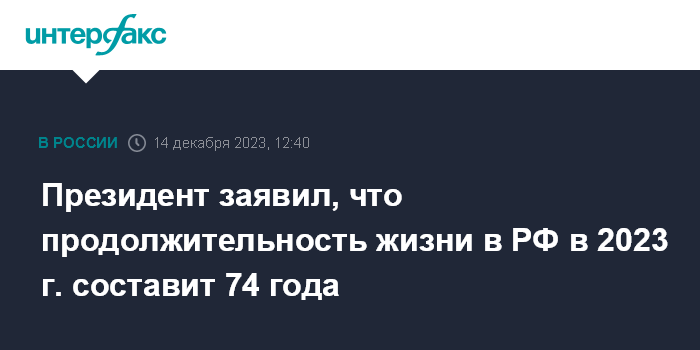Москва. 14 декабря. INTERFAX.RU - Продолжительность жизни в России в текущем году ожидается на уровне 74 лет, сообщил президент РФ Владимир Путин.