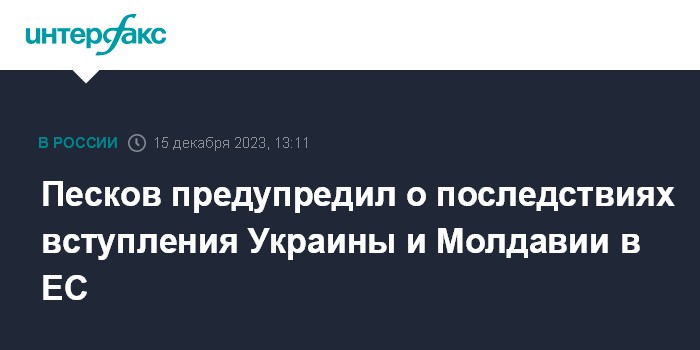 Москва. 15 декабря. INTERFAX.RU - Пресс-секретарь президента РФ Дмитрий Песков назвал политизированным решение Евросоюза начать переговоры с Украиной и Молдавией об их вступлении в ЕС; по его словам, вступление этих стран в ЕС может дестабилизировать союз.