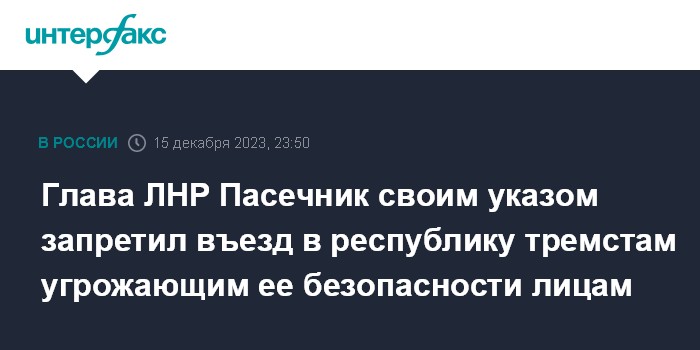 Глава ЛНР Пасечник своим указом запретил въезд в республику тремстам угрожающим ее безопасности лицам