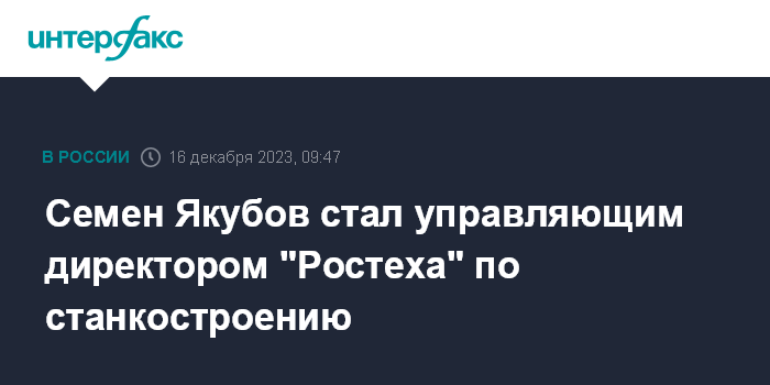 Москва. 16 декабря. INTERFAX.RU - Управляющим директором "Ростеха" по станкостроению и особым проектам назначен Семен Якубов, сообщила госкорпорация.