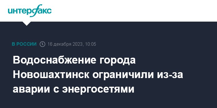Москва. 16 декабря. INTERFAX.RU - Подачу воды в город Новошахтинск Ростовской области ограничили в субботу, сообщил министр жилищно-коммунального хозяйства области Сергей Сизиков.