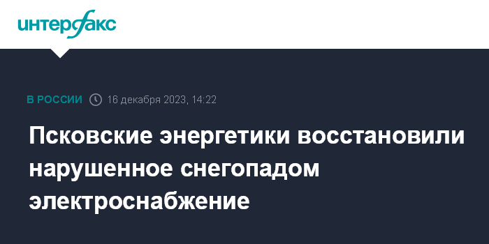 Москва. 16 декабря. INTERFAX.RU - "Россети Северо-Запад" восстановили основную сеть электроснабжения в Псковской области после снегопадов, сообщает пресс-служба компании.