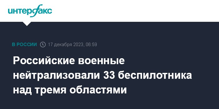 Москва. 17 декабря. INTERFAX.RU - Министерство обороны России заявило, что в ночь на воскресенье противовоздушная оборона перехватила и уничтожила 33 дрона над территориями трех областей РФ.