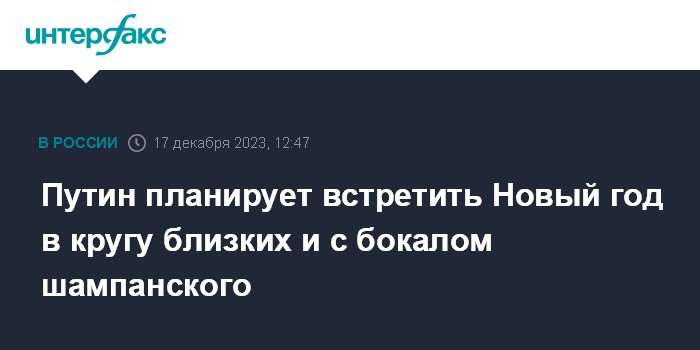 В интервью автору программы "Москва. Кремль. Путин" (Россия-1, ВГТРК) Павлу Зарубину Путин, отвечая на вопрос о планах на Новый год, сказал, что после того, как прозвучит новогоднее обращение президента, "дальше будет бокал шампанского с близкими людьми, разговор на бытовые темы".