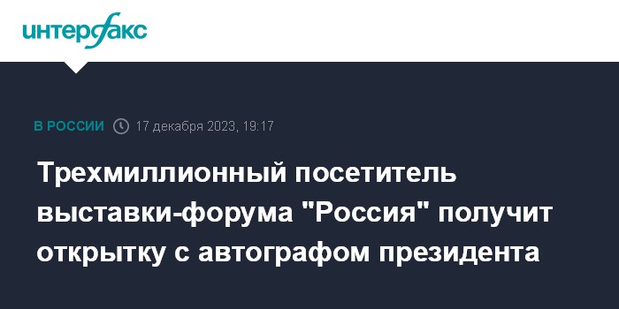 Москва. 17 декабря. INTERFAX.RU - Трехмиллионный посетитель международной выставки-форума "Россия", которая проходит на ВДНХ, получит новогоднюю открытку с автографом президента РФ Владимира Путина.