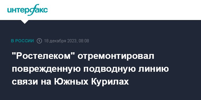 Москва. 15 декабря. INTERFAX.RU - "Ростелеком" досрочно завершил ремонтно-восстановительные работы участка подводной волоконно-оптической линии связи (ПВОЛС) на Кунашире и Шикотане (Южные Курилы), поврежденного 7 октября предположительно во время якорной стоянки судна.