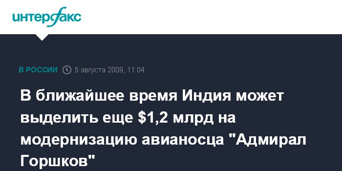 Москва. 5 августа. INTERFAX.RU - Вопрос о дополнительном финансировании контракта на ремонт и модернизацию тяжелого авианесущего крейсера "Адмирал Горшков" может быть решен положительно уже в ближайшее время, сообщил "Интерфаксу-АВН" в среду источник, близкий к переговорам. "Мы рассчитываем, что на предстоящих в августе переговорах будет достигнута окончательная договоренность с индийскими партнерами о дополнительном выделении 1,2 миллиарда долларов на ремонт и модернизацию авианосца "Адмирал Горшков", - сказал собеседник агентства. По его словам, уверенность в успехе переговоров вселяет заявление помощника министра обороны Индии Палам Раджи (Pallam Raji) о готовности Дели рассмотреть предложения России об увеличении стоимости контракта.