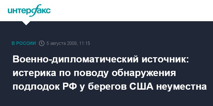 Москва. 5 августа. INTERFAX.RU - Плавание военных кораблей вне границ территориального моря другого государства в соответствии с нормами международного морского права является обычной практикой, заявил в среду "Интерфаксу-АВН" высокопоставленный военно-дипломатический источник в Москве. Комментируя сообщения газеты New York Times о двух атомных подводных лодках ВМФ России, якобы замеченных вблизи берегов США, он заявил: "Все, что касается действий военных кораблей в открытом море, категорически нельзя расценивать как нарушение".