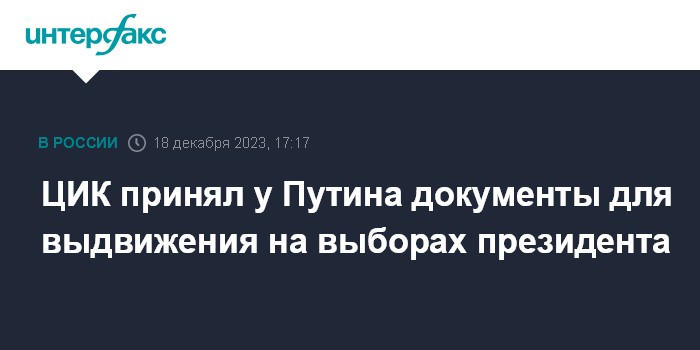 Москва. 18 декабря. INTERFAX.RU - Центризбирком России принял у действующего президента РФ Владимира Путина документы, которые требуются для выдвижения на предстоящих выборах главы государства, сообщил "Интерфаксу" член ЦИК Константин Мазуревский.