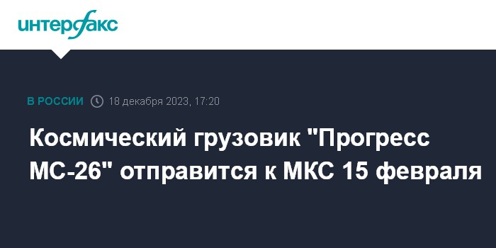 Москва. 18 декабря. INTERFAX.RU - Грузовой космический корабль "Прогресс МС-26" отправится к Международной космической станции (МКС) в середине февраля с космодрома Байконур, сообщили в "Роскосмосе" в понедельник.