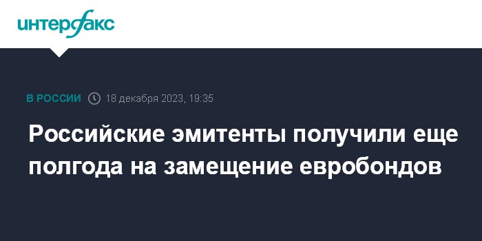Москва. 18 декабря. INTERFAX.RU - Российские эмитенты получили еще полгода на исполнение обязательства по замещению евробондов локальными бумагами.
