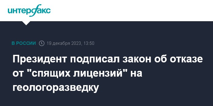 Москва. 19 декабря. INTERFAX.RU - Президент Владимир Путин подписал поправки к закону "О недрах", призванные прекратить практику "спящих" лицензий на геологоразведку - теперь плата за недра будет кратно увеличена, если геологоразведка участка затягивается. Документ опубликован на официальном портале правовой информации.
