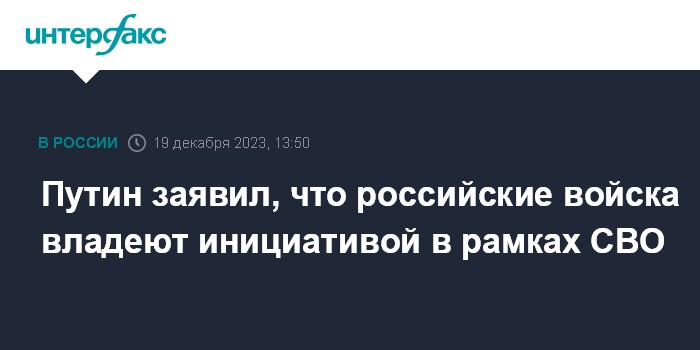 Москва. 19 декабря. INTERFAX.RU - Российские войска владеют инициативой в зоне специальной военной операции (СВО), противник несет тяжелые потери, в значительной степени растратил резервы, заявил президент РФ Владимир Путин.