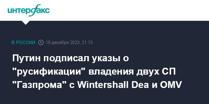 Москва. 19 декабря. INTERFAX.RU - Президент РФ Владимир Путин подписал указы, согласно которым создаются ООО, куда передаются все права, активы и обязанности совместных предприятий "Газпрома" с немецкой Wintershall Dea и австрийской OMV - "Севернефтегазпрома" (разрабатывает Южно-Русское месторождение), а также "Ачимгаза" и "Ачим девелопмента" (участки глубокозалегающих горизонтов Уренгойского месторождения) соответственно.