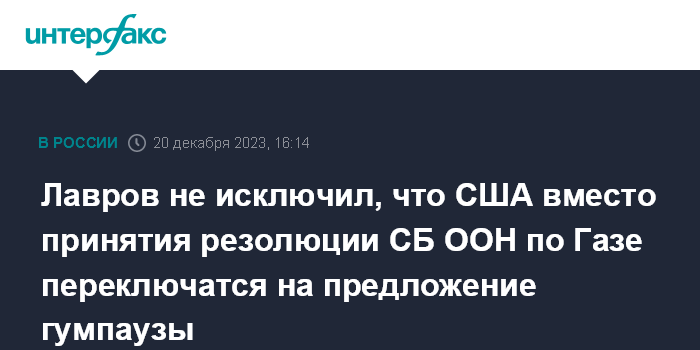 "Я не исключаю, что наши американские коллеги придут сегодня в Нью-Йорке на заседание Совета безопасности и скажут: "Вы знаете, есть хорошее предложение о гуманитарной паузе на неделю, давайте резолюцию не будем принимать". Надеюсь, что этого не произойдет, что у них есть осознание своей ответственности, но такого варианта я не исключаю", - добавил российский министр.