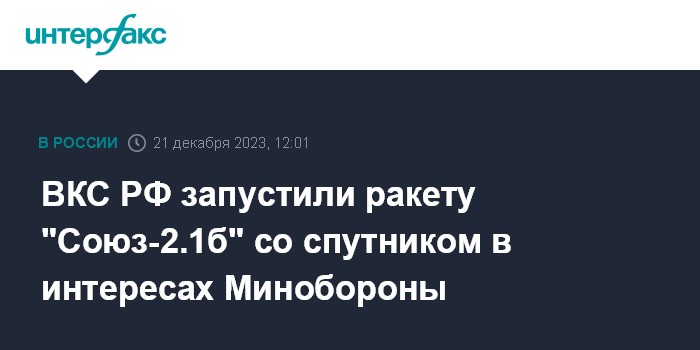 "В четверг, 21 декабря, в 11 часов 48 минут с Государственного испытательного космодрома Министерства обороны Российской Федерации (космодром Плесецк) в Архангельской области боевыми расчетами космических войск ВКС проведен пуск ракеты-носителя среднего класса "Союз-2.1б" с космическим аппаратом (КА) в интересах Минобороны России", - говорится в сообщении.