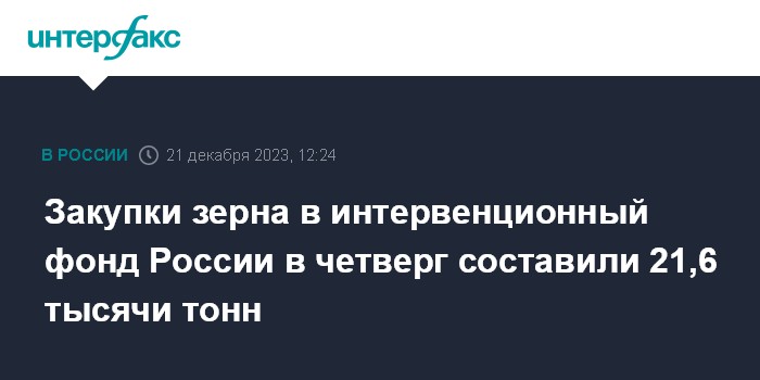 Закупки зерна в интервенционный фонд России в четверг составили 21,6 тысячи тонн