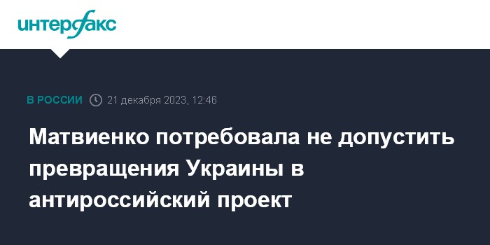 Москва. 21 декабря. INTERFAX.RU - Спикер Совета Федерации Валентина Матвиенко заявила, что пока не видит предпосылок для завершения конфликта на Украине и считает, что СВО должна продолжаться до достижения ее целей, среди которых - сделать так, чтобы Украина не была антироссийским проектом.