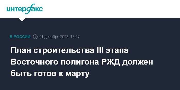 Москва. 21 декабря. INTERFAX.RU - План строительства III этапа Восточного полигона ОАО "РЖД" должен быть подготовлен к следующей весне, сообщил телеканалу "Россия 24" вице-премьер Марат Хуснуллин. Его спросили, что обсуждалось на недавнем совещании у президента по развитию Восточного полигона.