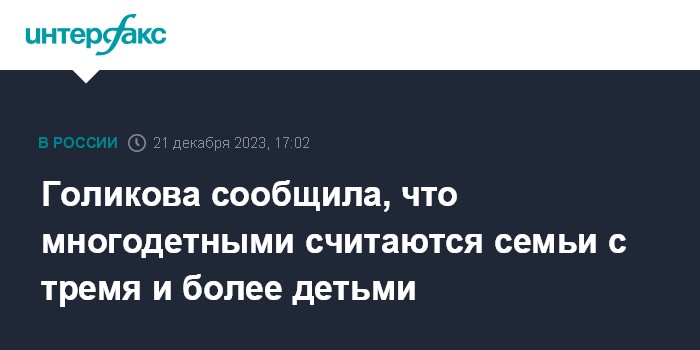 Москва. 21 декабря. INTERFAX.RU - Вице-премьер Татьяна Голикова сообщила, что критерием многодетной семьи в России может считаться семья с тремя детьми или более.
