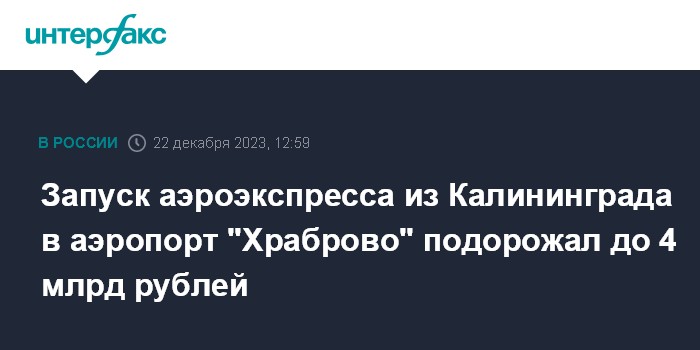 Запуск аэроэкспресса из Калининграда в аэропорт "Храброво" подорожал до 4 млрд рублей