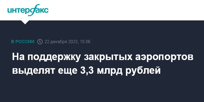 Москва. 22 декабря. INTERFAX.RU - Правительство РФ выделит на поддержку закрытых аэропортов юга и центральной части страны еще около 3,3 млрд рублей.