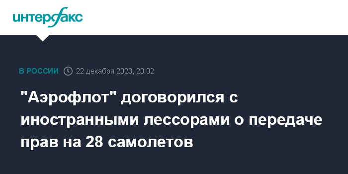Москва. 22 декабря. INTERFAX.RU - Группа "Аэрофлот" в конце декабря завершила процесс урегулирования по 28 самолетам с несколькими группами иностранных лизингодателей, сообщил представитель компании журналистам.