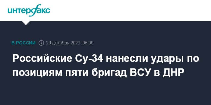 Москва. 23 декабря. INTERFAX.RU - Лётчики самолётов Су-34 атаковали расположения частей и подразделений пяти бригад вооружённых сил Украины на территории Донецкой народной республики, сообщил начальник пресс-центра группировки войск "Юг" Вадим Астафьев.