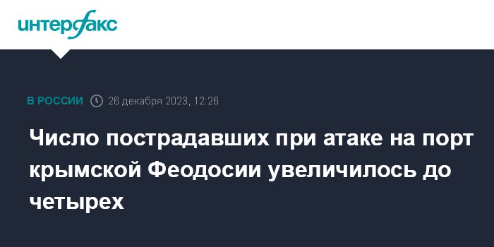Москва. 26 декабря. INTERFAX.RU - Четыре человека, по уточненным данным, получили ранения в результате атаки на порт в Феодосии на востоке Крыма в ночь на вторник, сообщает министерство здравоохранения республики в своем телеграм-канале.