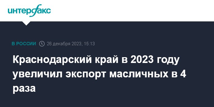 Москва. 26 декабря. INTERFAX.RU - Краснодарский край в 2023 году увеличил экспорт масличных культур почти в четыре раза. Об этом сообщили "Интерфаксу" в Новороссийском филиале ФГБУ "Центр оценки качества зерна" (ЦОКЗ).