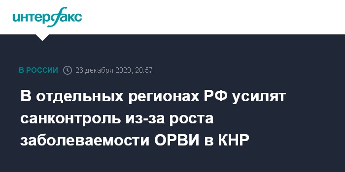 Москва. 26 декабря. INTERFAX.RU - Роспотребнадзор усилил меры санитарно-карантинного контроля в населенных пунктах, в которых есть транспортное сообщение с Китаем, из-за роста заболеваемости респираторными инфекциями в КНР, сообщила глава ведомства Анна Попова.