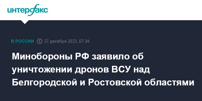 Москва. 27 декабря. INTERFAX.RU - Российские военные заявили, что средства противовоздушной обороны в ночь на среду уничтожили два украинских беспилотника над территориями Белгородской и Ростовской областей.