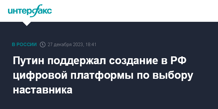Москва. 27 декабря. INTERFAX.RU - Президент РФ Владимир Путин поддержал предложение создать всероссийскую цифровую платформу, где каждый мог бы выбрать себе наставника по роду своей деятельности.