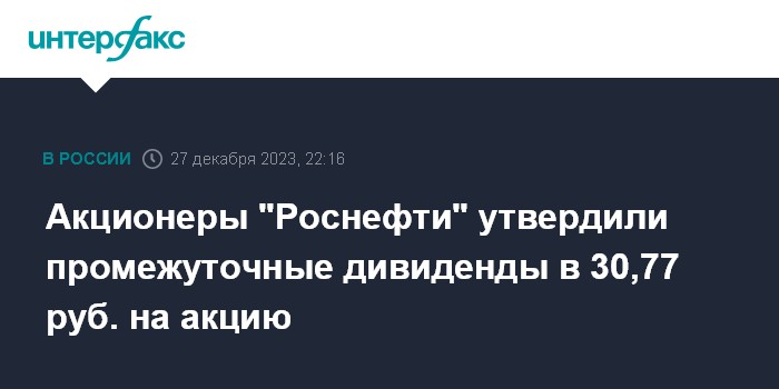 Москва. 27 декабря. INTERFAX.RU - Акционеры "Роснефти" на внеочередном собрании в заочной форме утвердили выплату промежуточных дивидендов в размере 30,77 рубля на акцию, сообщила компания.