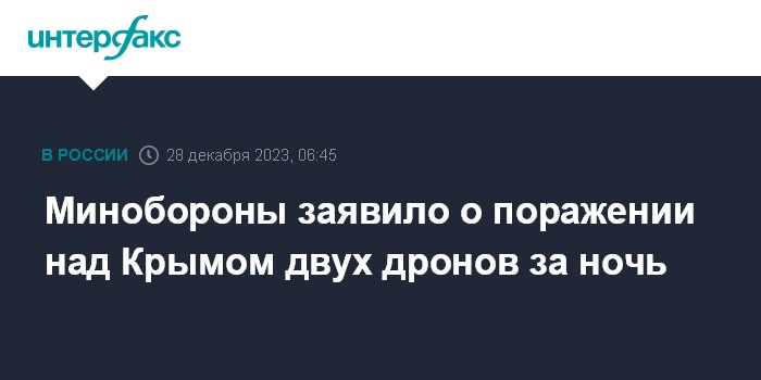 Москва. 28 декабря. INTERFAX.RU - Министерство обороны России сообщило, что в ночь на четверг над территорией Крыма система ПВО уничтожила два дрона ВСУ.