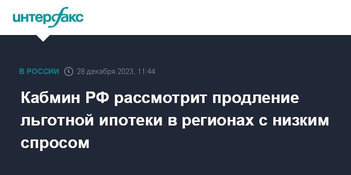 Москва. 28 декабря. INTERFAX.RU - Правительство России может рассмотреть продление льготной ипотеки в отдельных регионах с низким спросом, заявил в четверг вице-премьер РФ Марат Хуснуллин.