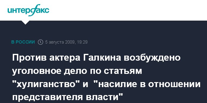 По его словам, 5 августа текущего года завершены проверочные мероприятия и возбуждено уголовное дело в отношении актера Владислава Галкина по факту совершения преступлений, предусмотренных ч. 1 ст. 213 (хулиганство с применением предметов, используемых в качестве оружия) и ч. 1 ст. 318 (применение насилия в отношении представителя власти) УК РФ.