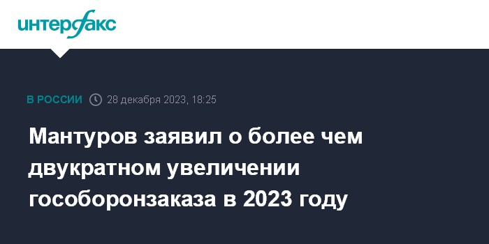 Москва. 28 декабря. INTERFAX.RU - Объем поставок военной техники по гособоронзаказу в 2023 году более чем в два раза больше, чем в предыдущем, заявил через пресс-службу Минпромторга вице-премьер - глава ведомства Денис Мантуров.