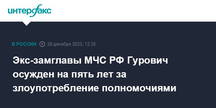 Москва. 29 декабря. INTERFAX.RU - Мосгорсуд назначил бывшему заместителю главы МЧС России Андрею Гуровичу пять лет колонии общего режима по обвинению в злоупотреблении полномочиями, сообщили "Интерфаксу" в суде.