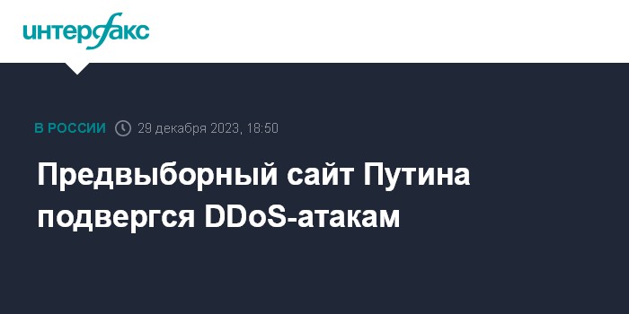 Москва. 29 декабря. INTERFAX.RU - Сайт кандидата в президенты России на выборах в марте 2024 года, действующего главы государства Владимира Путина подвергся DDoS-атакам из-за рубежа; в настоящее время он работает штатно, сообщила пресс-секретарь избирательного штаба Путина Александра Суворова.