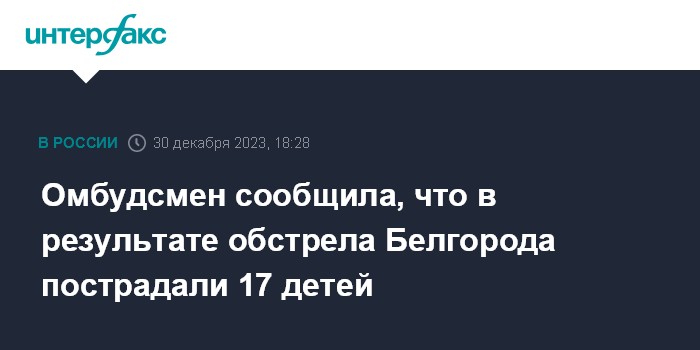 Москва. 30 декабря. INTERFAX.RU - В результате обстрела Белгорода со стороны Украины ранены 17 детей, четверо находятся в тяжелом состоянии, сообщила уполномоченный по правам ребенка в РФ Мария Львова-Белова.