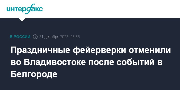 Москва. 31 декабря. INTERFAX.RU - Новогодние фейерверки в ночь с 31 декабря на 1 января отменены во Владивостоке из-за трагических событий в Белгороде, сообщил мэр Владивостока Константин Шестаков.