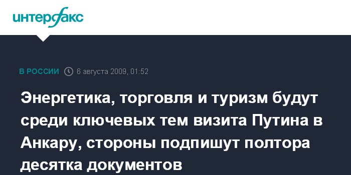 Энергетика, торговля и туризм будут среди ключевых тем визита Путина в Анкару, стороны подпишут полтора десятка документов